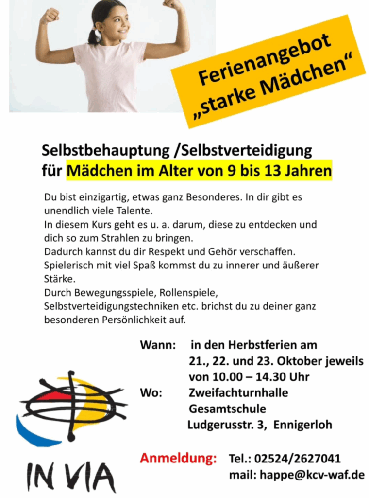 ENNIGERLOH – In den Herbstferien findet in Ennigerloh ein besonderes Angebot für Mädchen im Alter von 9 bis 13 Jahren statt. Unter dem Motto „Starke Mädchen“ dreht sich alles um Selbstbehauptung und Selbstverteidigung.