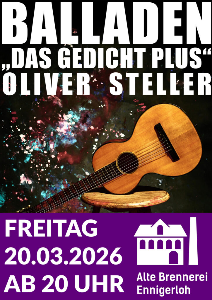 ENNIGERLOH – Literatur, Musik und große Gefühle: Am Freitag, 20. März 2026 um 20 Uhr gastiert der bekannte Rezitator und Musiker Oliver Steller mit seinem Programm „Balladen – Das Gedicht Plus“ in der Alte Brennerei Ennigerloh.